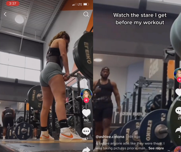 First, of I wouldn’t really define this as a stare, he’s walking from one end to the barbell to the other end to change weights and he even looks down briefly in the middle. I would as far as to say hey, this is simply one gym rat acknowledging another gym rat that’s doing the same exercise to say hey you look great which you do, great job that’s impressive. I do this all the time and there are no bad intentions behind it. I don’t like how you say in the caption that you posted this because it is funny. Women are harassed in gyms and it needs to stop, this is not a joke, it’s also not a joke to portray somebody in a video to make them look like a pervert or someone that stares at women in your gym community. This can be horrible for this mans image, his family, you need to do better, mind your own business.